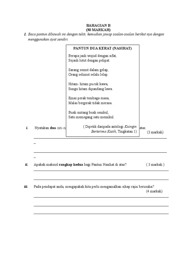 Komsas online worksheet for tingkatan 1. Setiap perbuatan dan tindakan yang dilakukan berkait rapat dengan sifat seseorang itu sendiri. Berapa jauh wujud dengan sifat, sejauh lutut dengan pelipat penampilan zahir seseorang itu dapat menggambarkan sikap yang dimiliki, kerena segala perbuatan . Seterusnya, tajuk ini akan menerangkan secara . Gaya bahasa dan keindahan bunyi pantun dua kerat nasihat.
